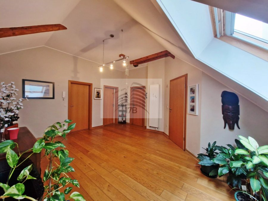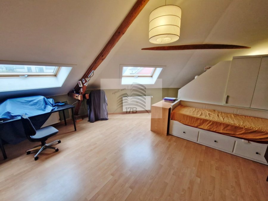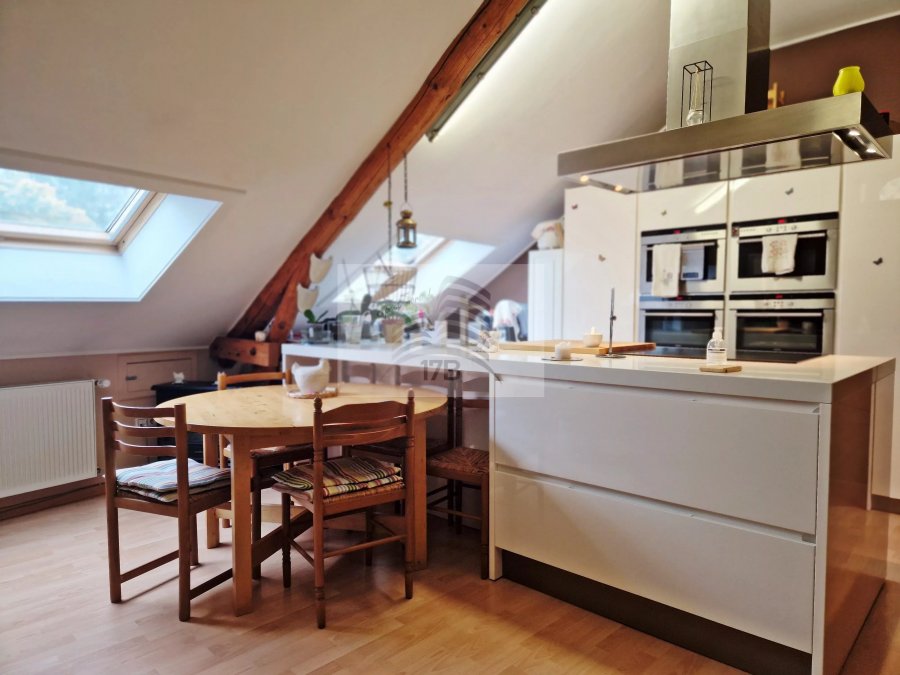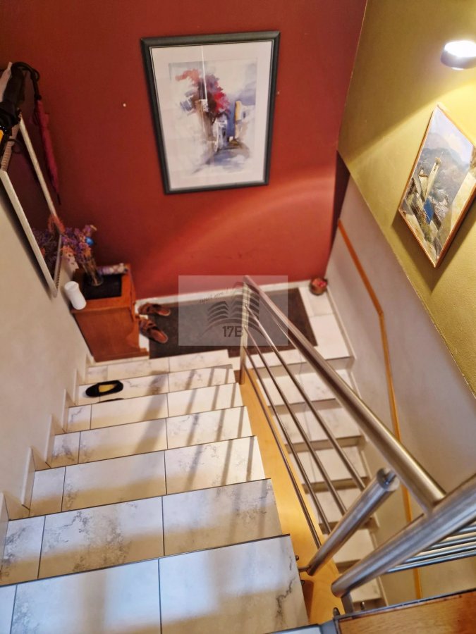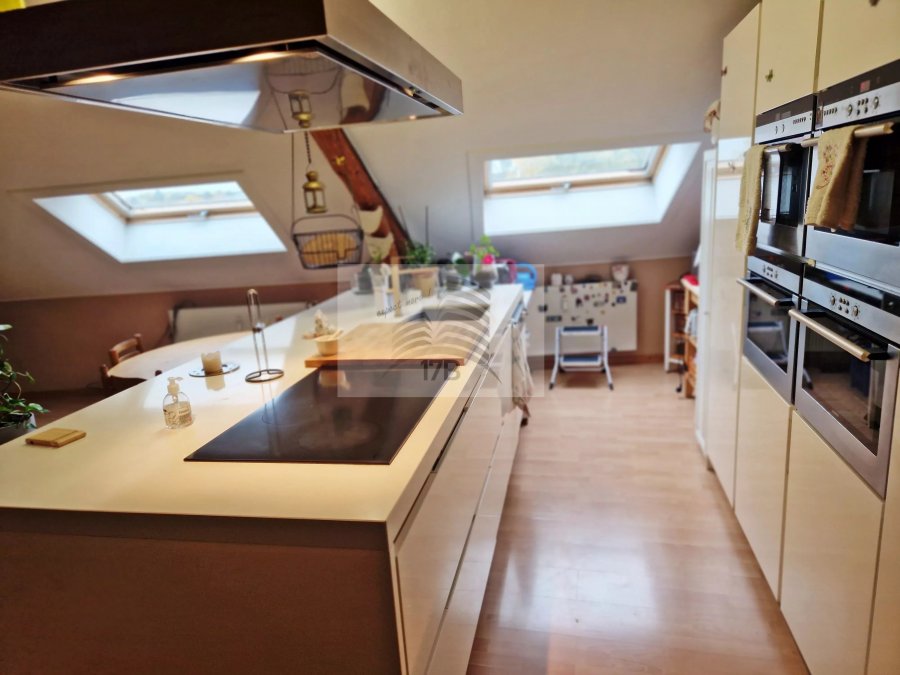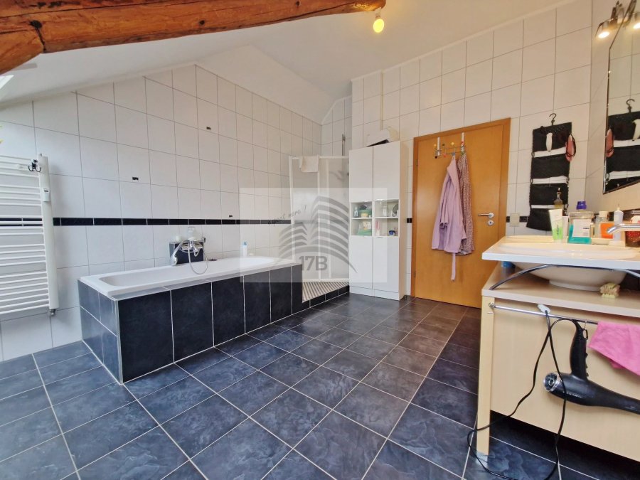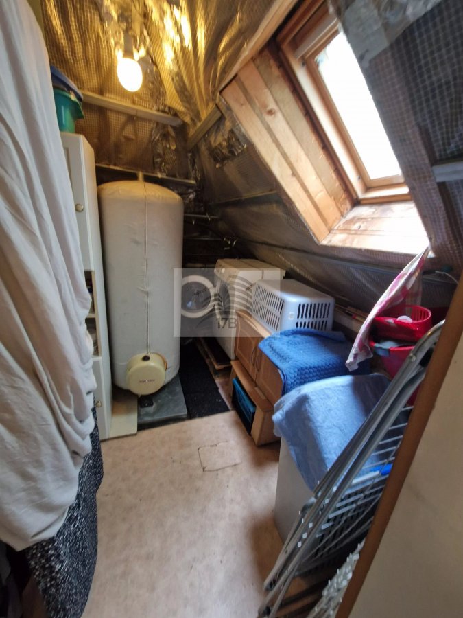 Große Eingangshalle von 18 m2, Einbauküche offen zum Wohn-/Esszimmer, Badezimmer, Gäste-WC, zwei große Schlafzimmer, Dachboden/Waschküche.